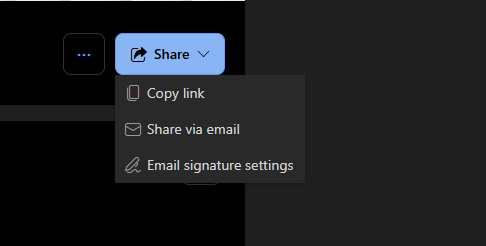 You'll have three options, copy the link, share the page via email, or edit your signature settings. Keep in mind, here we have a default corporate signature. So if you put the link in your outlook signature it'll appear above your corporate signature your email recipients see.